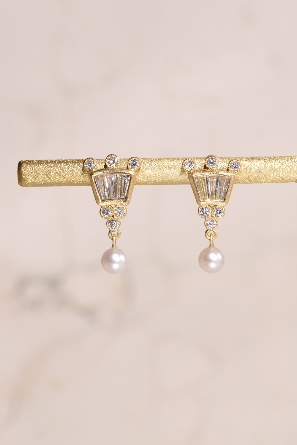 光を受けて煌めきを放つダイヤモンドピアス。テーパーダイヤモンド、ラウンドのメレダイヤモンドともVSクラリティのものを使用。てりの良い上質なあこやパールを組み合わせたエレガントな意匠は、手の込んだ、確かな仕立てにより形作られます。可憐で気品溢れるデザインはどんな場面でも美しく耳元を飾る逸品です。