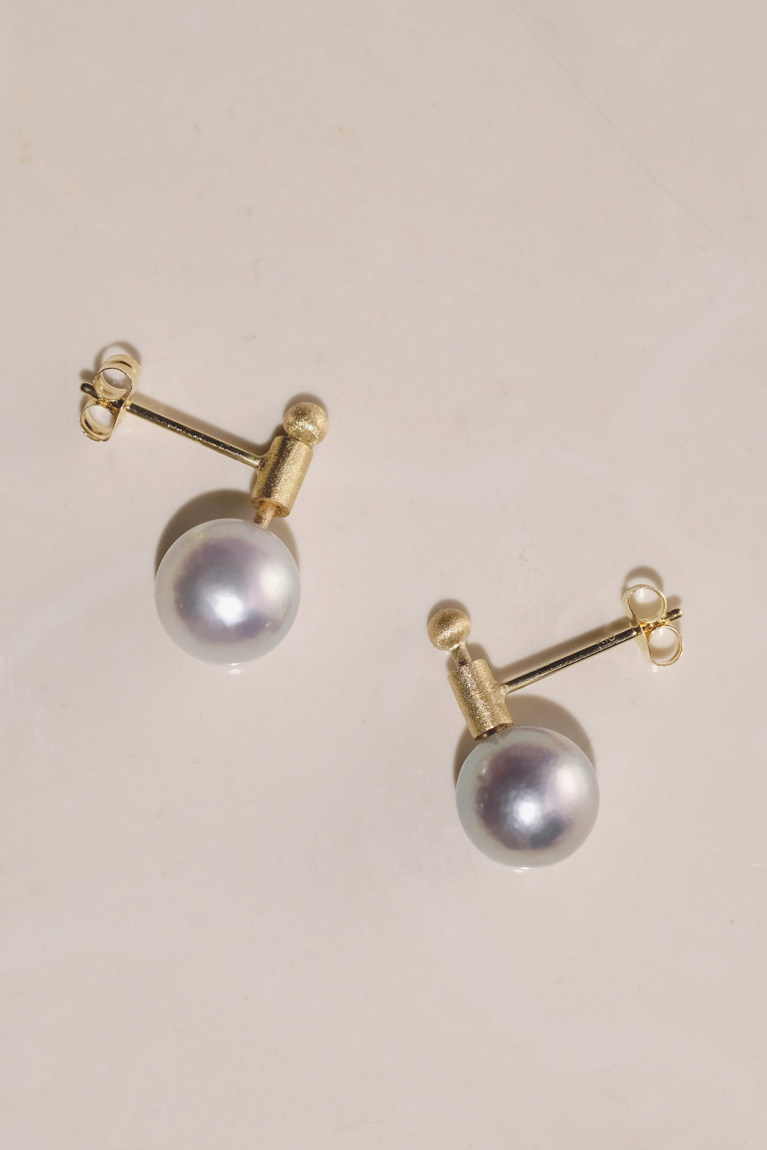 深い色合いが美しいアコヤパールを用いたピアス。 軸(axis)を中心にボディーが回転する構造で、パールの表情を360度楽しめるデザインに。