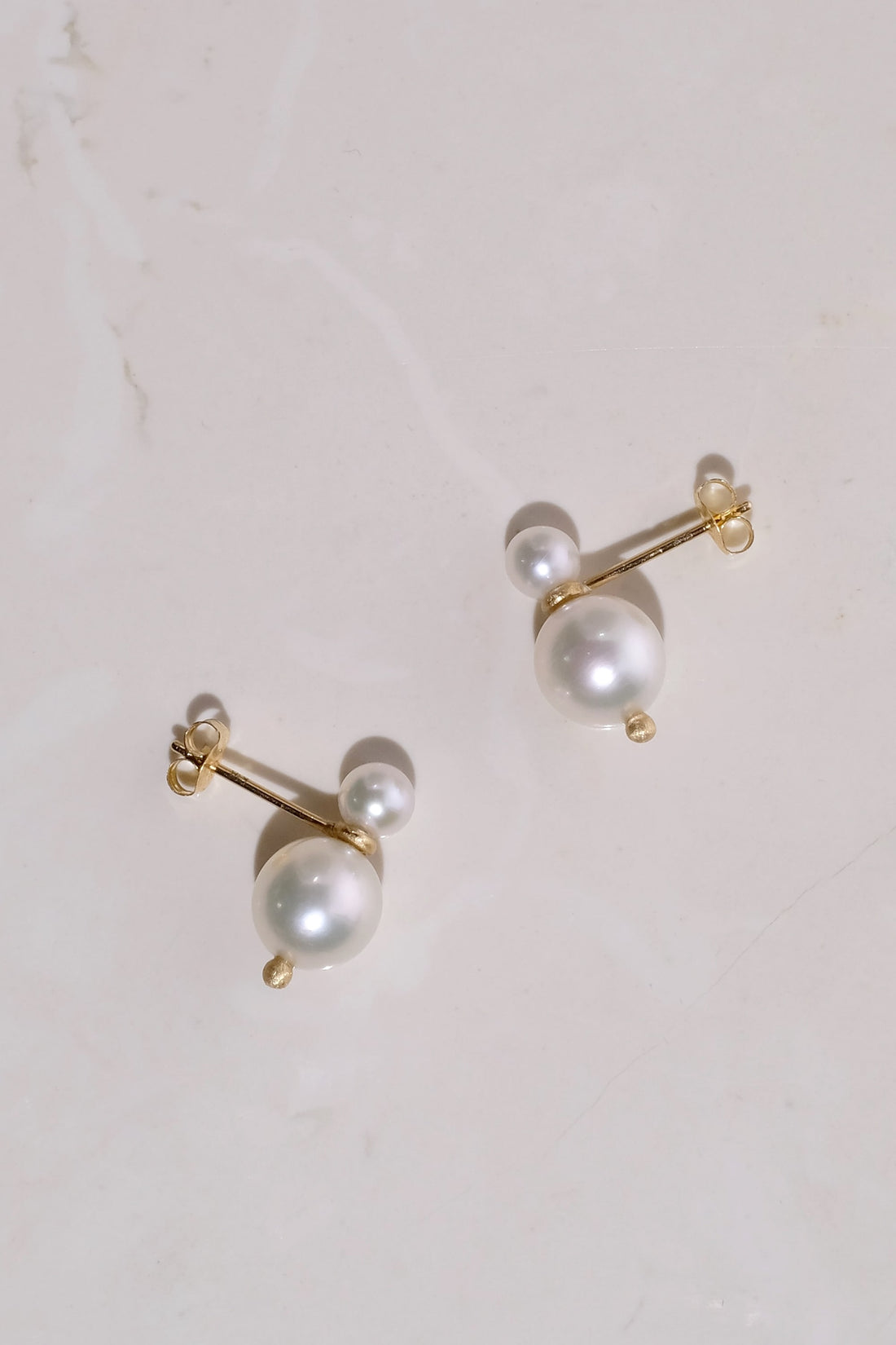 大小2つのあこやパールを連ねたスタッドピアス。上品なクリームカラーのクラシカルな佇まいが美しく耳元を飾ります。場面を選ばず、カジュアルにも、また、ドレッシーなコーディネートにも合うデザインです。