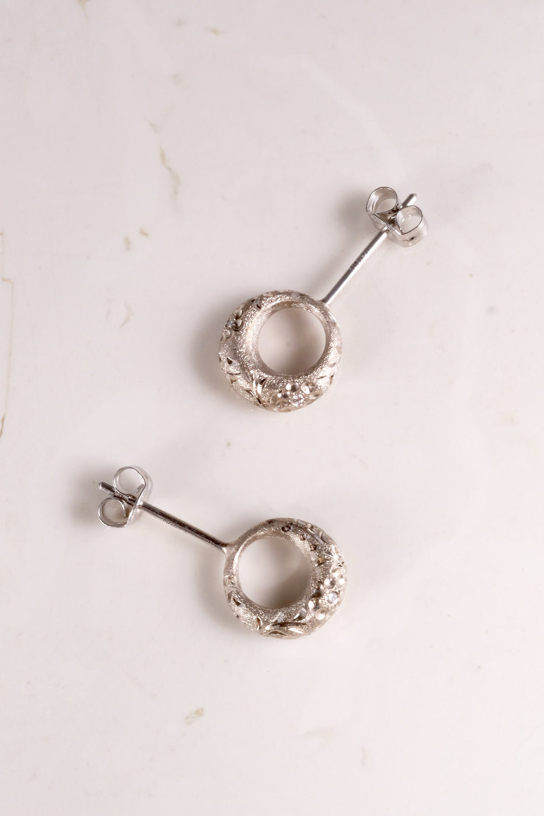マーガレットのリースをイメージしたピアス。メレダイヤモンドを花の彫り模様の中心に配し、マーガレットが満開に咲く様子を表現しました。伝統技法と現代的デザインの掛け合わせにより、モダンであると同時にクラシックな品格が備わります。
