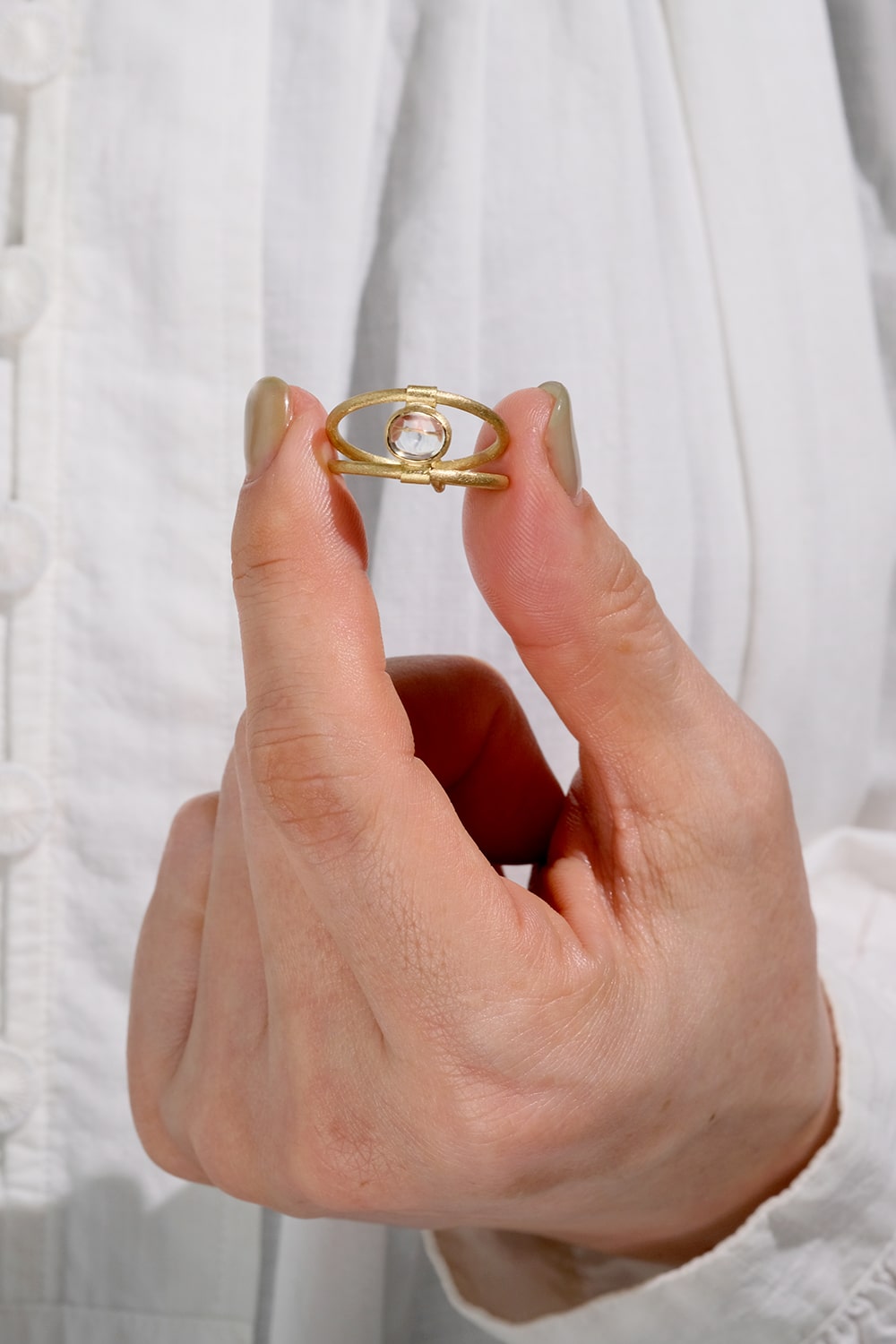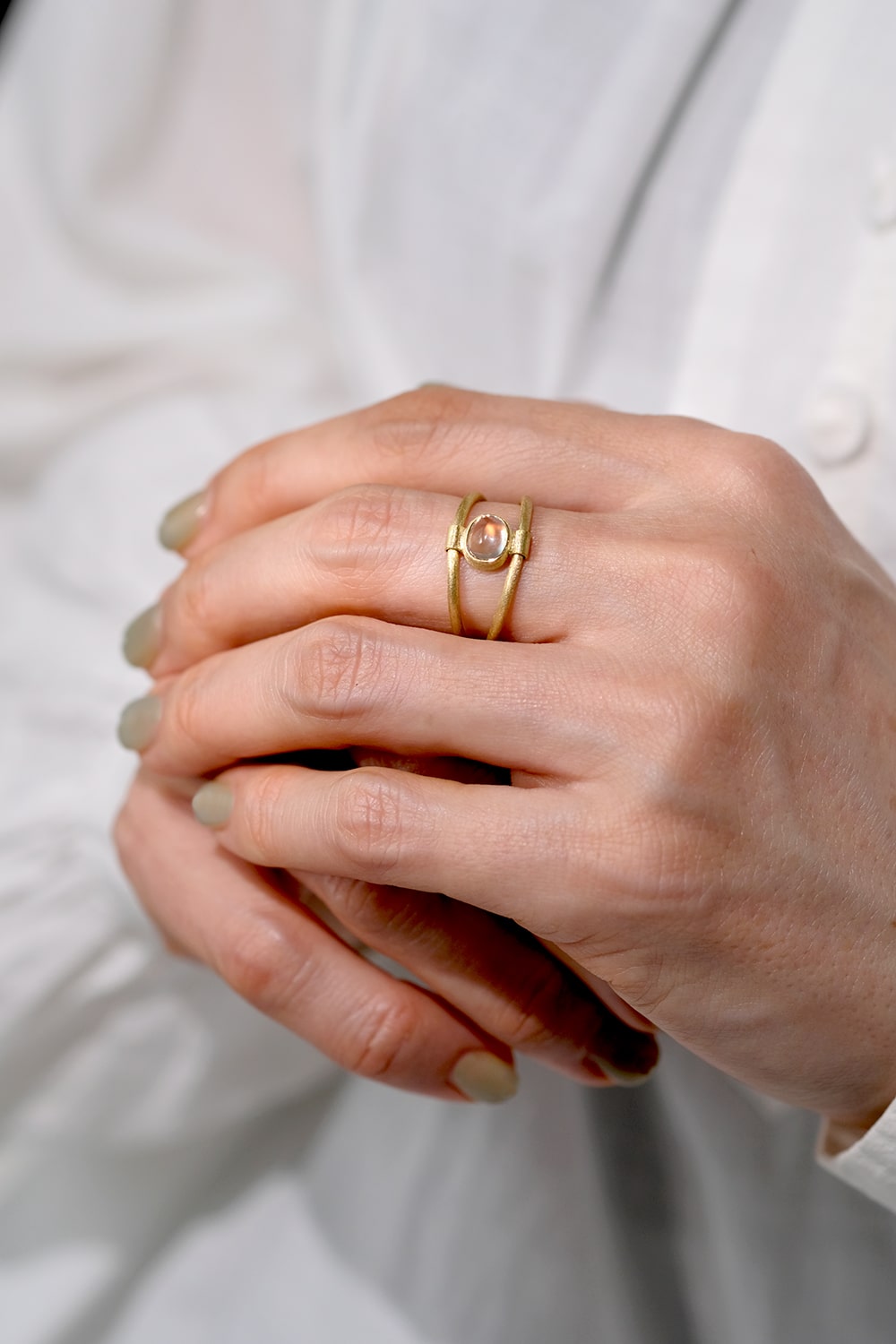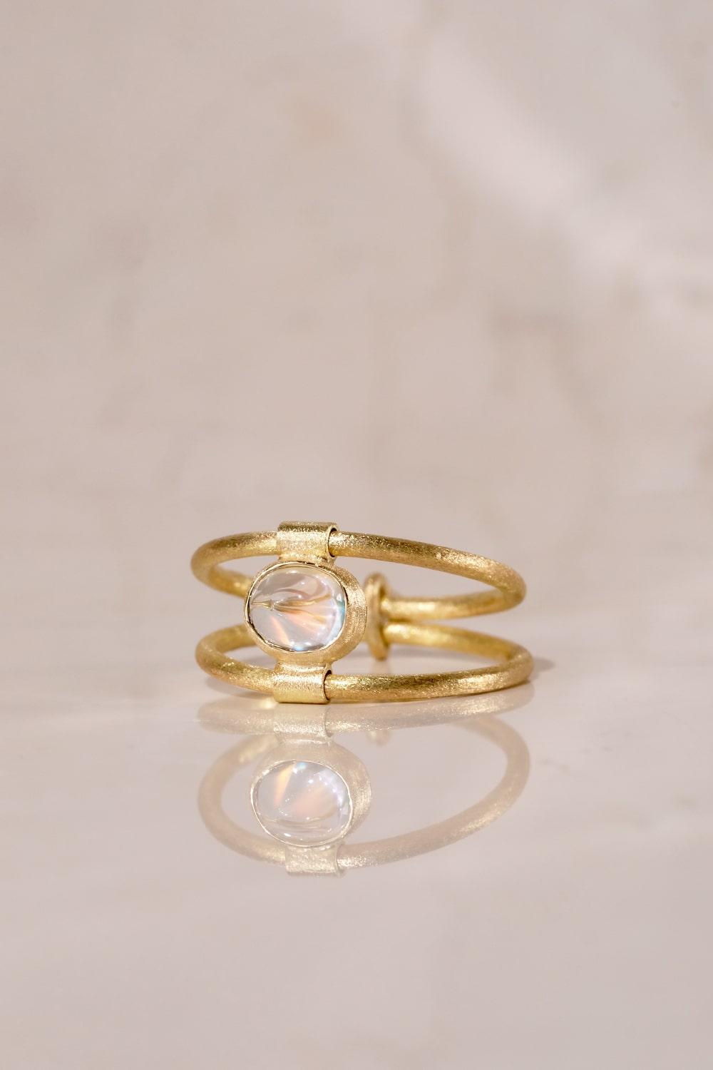 惑星の軌道をイメージしたオービットリング。インド産のレインボームーンストーンを用いたこのリングは、シンプルでありながらも、宝石が軌道を描くような動きを感じさせるデザインです。
