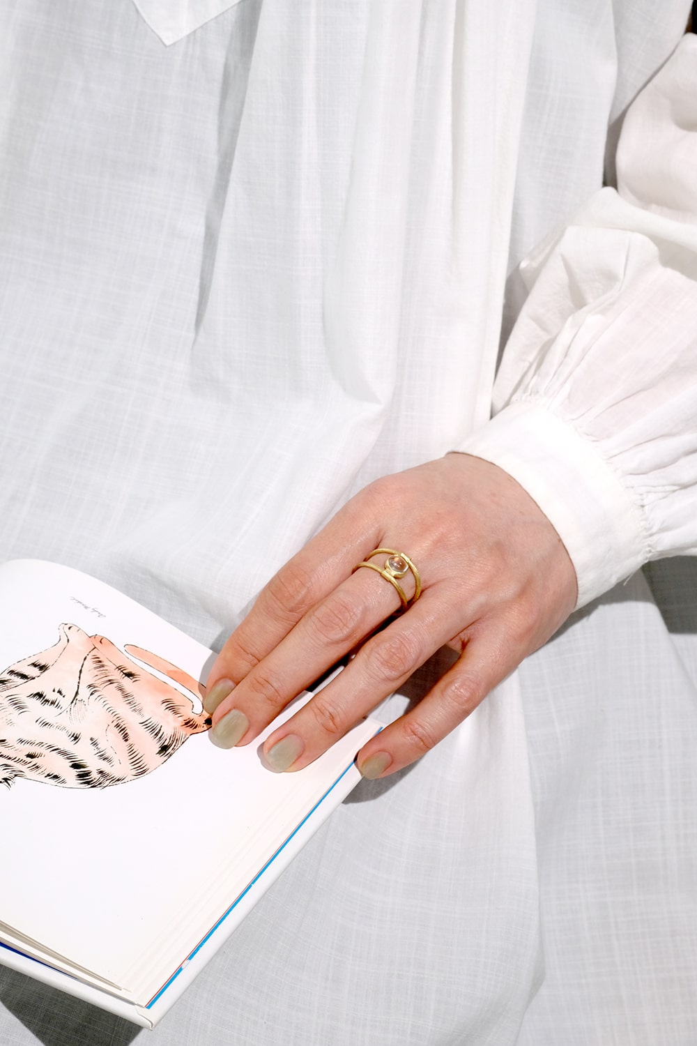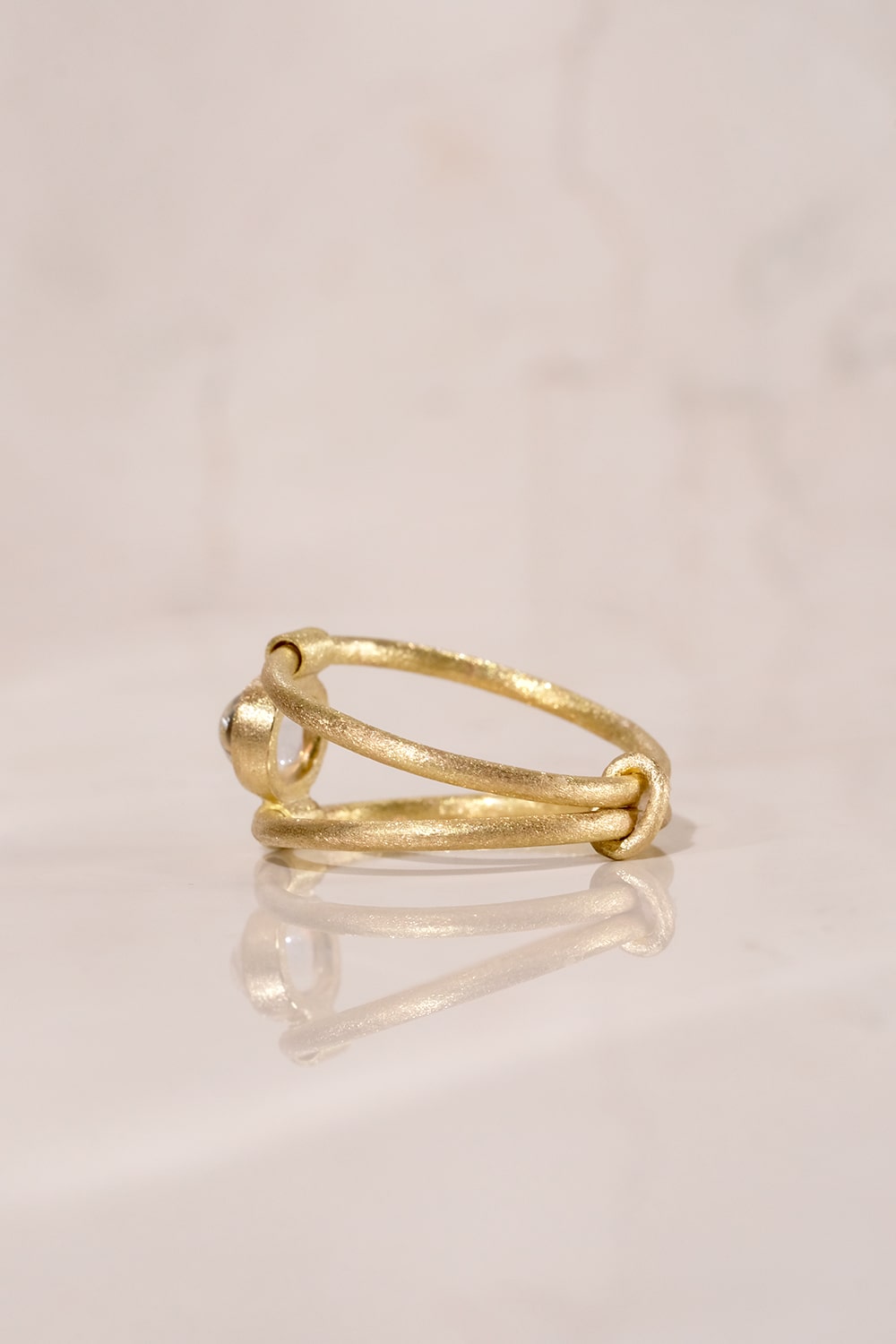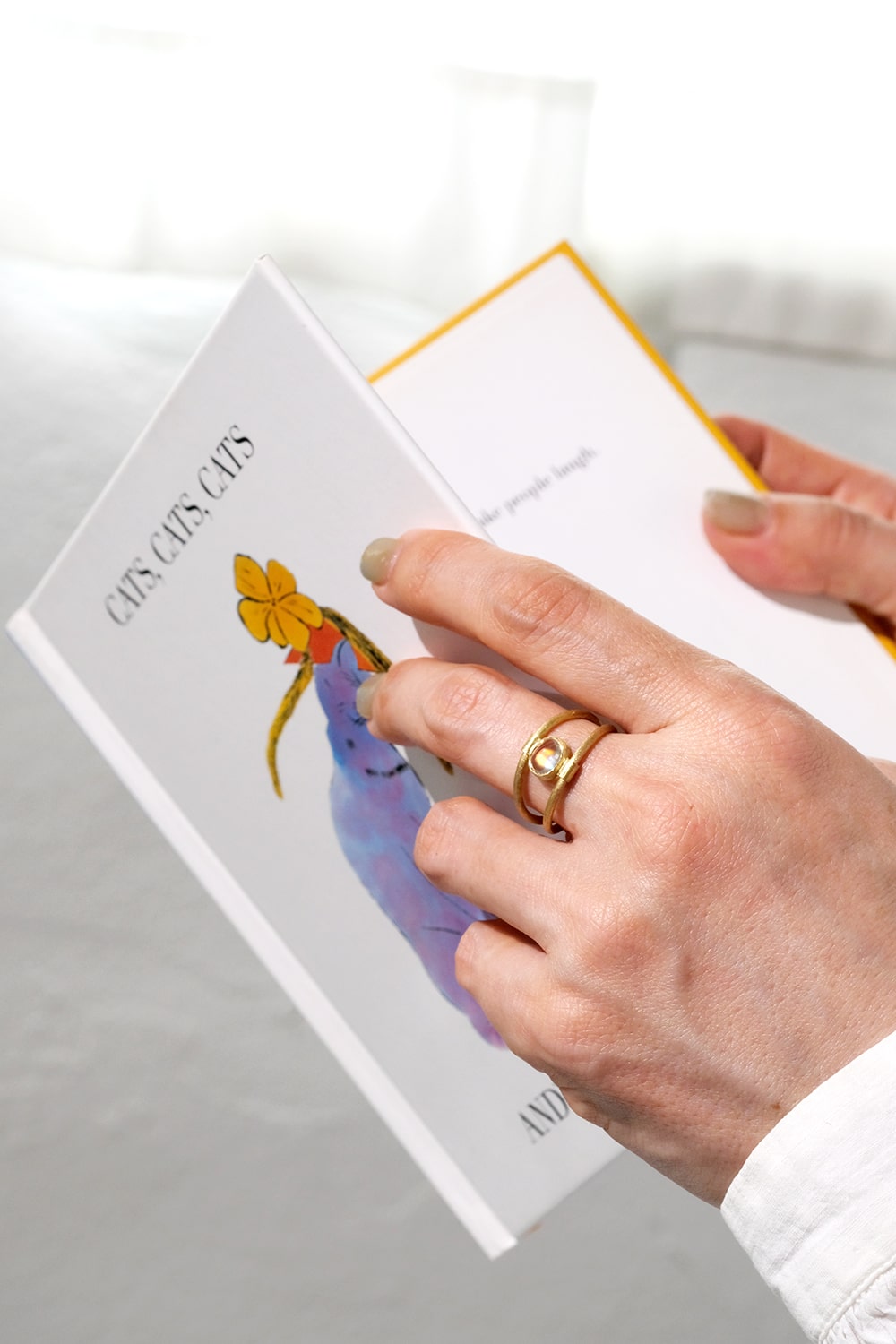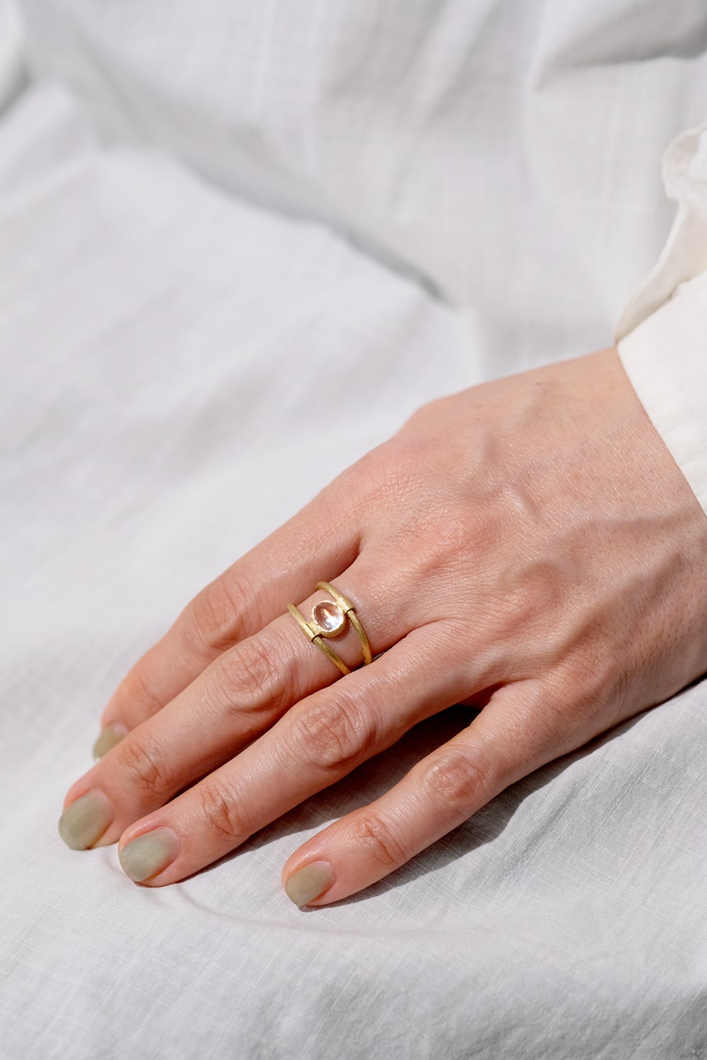 惑星の軌道をイメージしたオービットリング。インド産のレインボームーンストーンを用いたこのリングは、シンプルでありながらも、宝石が軌道を描くような動きを感じさせるデザインです。