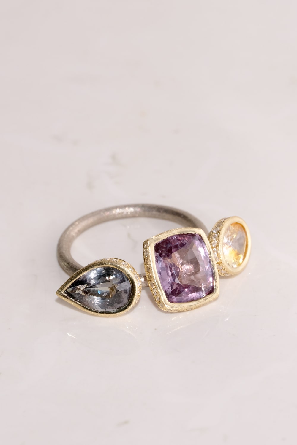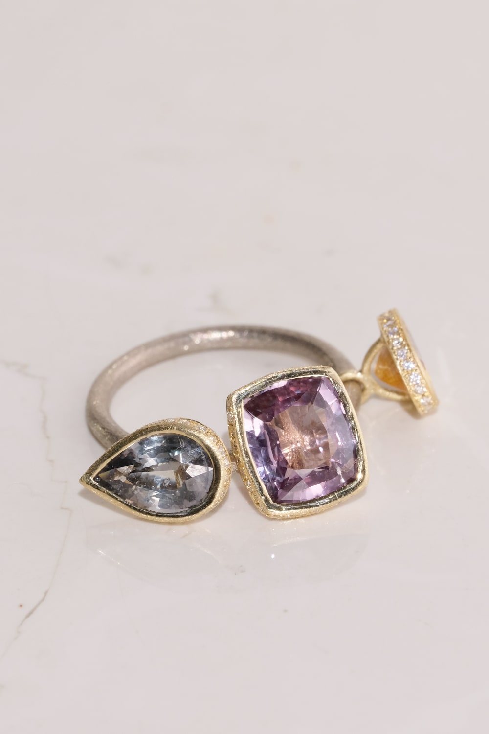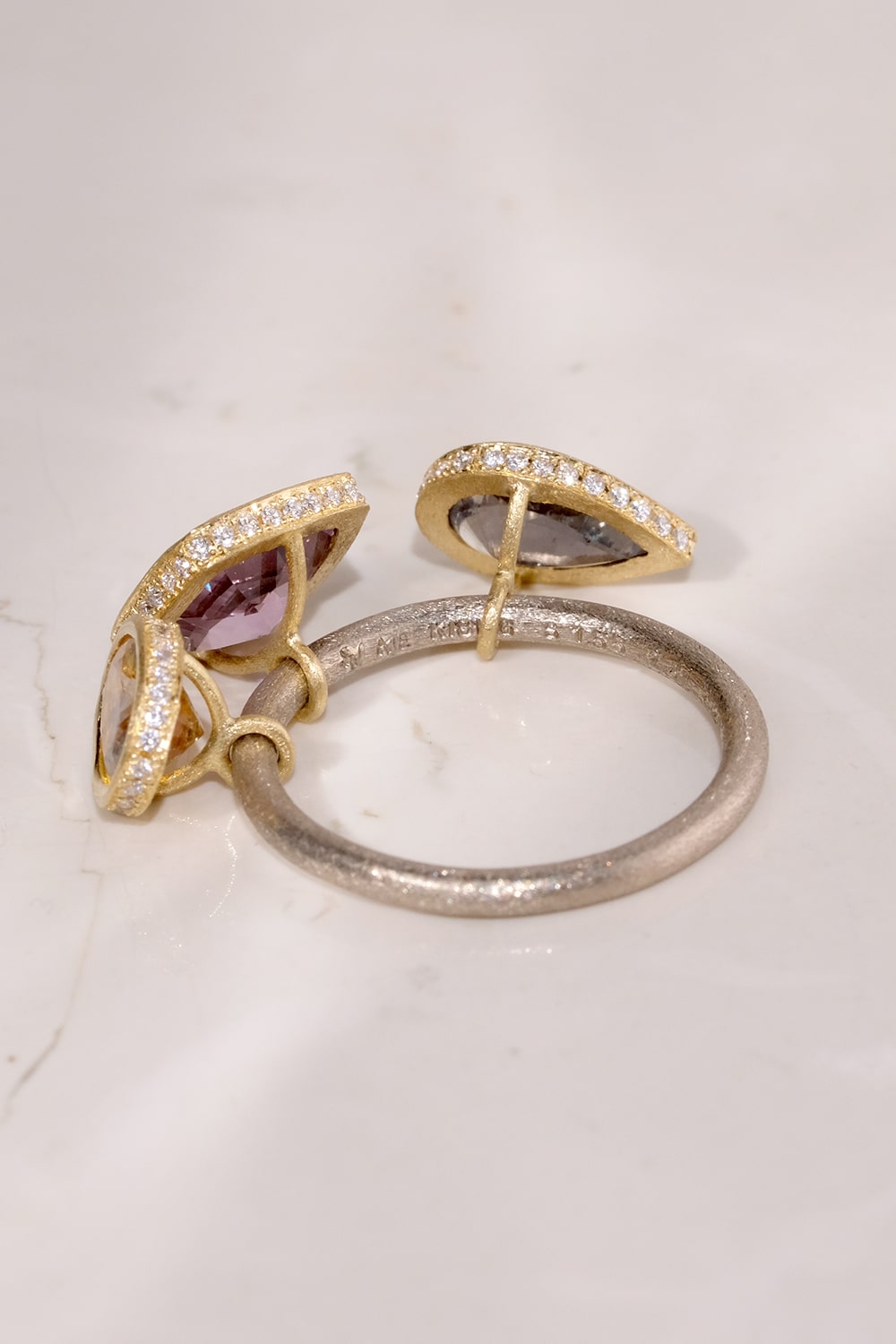 朝焼けのような柔らかな優しい色合いのサファイアを組み合わせ、台座の周縁をVSクラリティのメレダイヤモンドで取り巻きました。腕部分はホワイトゴールドを使用し、台座のイエローゴールドとの色合いのコントラストが美しいデザイン。SIXTH NIGHTの技術と遊び心を惜しみなく注いだ逸品です。