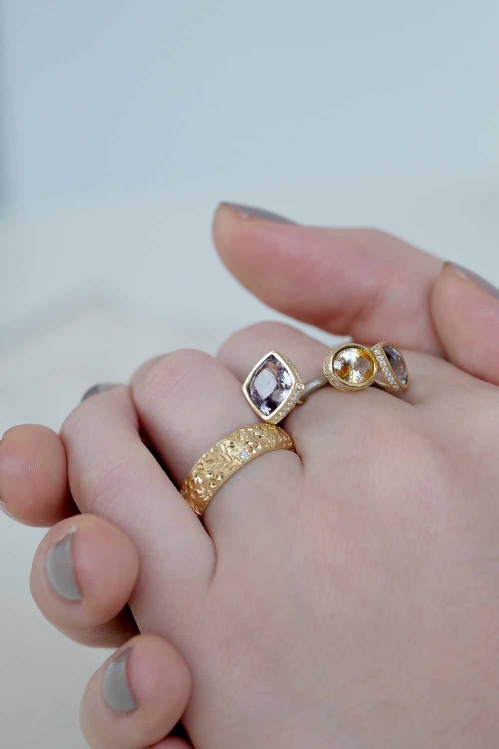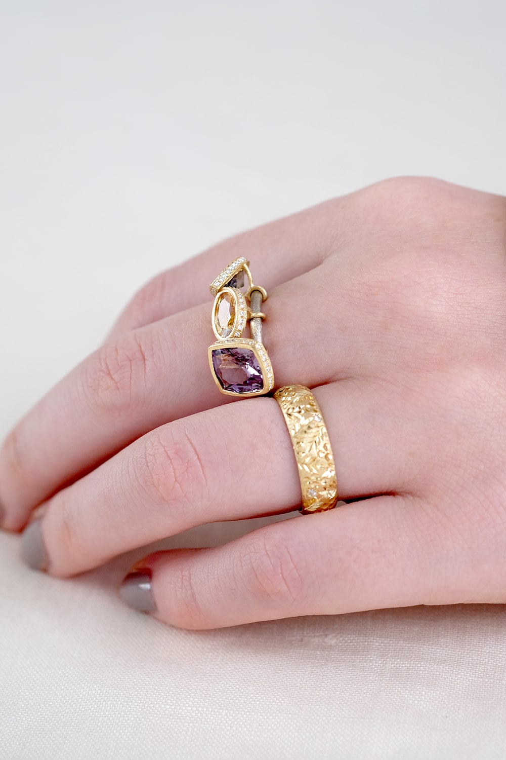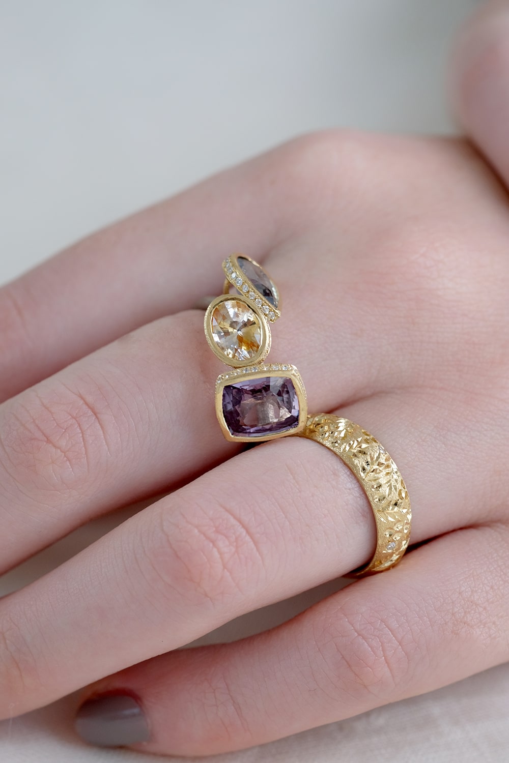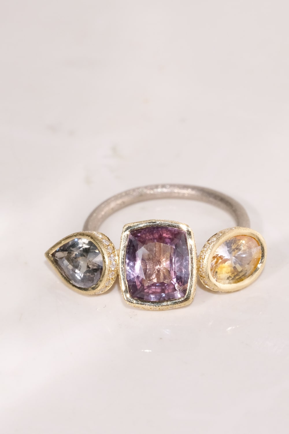 朝焼けのような柔らかな優しい色合いのサファイアを組み合わせ、台座の周縁をVSクラリティのメレダイヤモンドで取り巻きました。腕部分はホワイトゴールドを使用し、台座のイエローゴールドとの色合いのコントラストが美しいデザイン。SIXTH NIGHTの技術と遊び心を惜しみなく注いだ逸品です。
