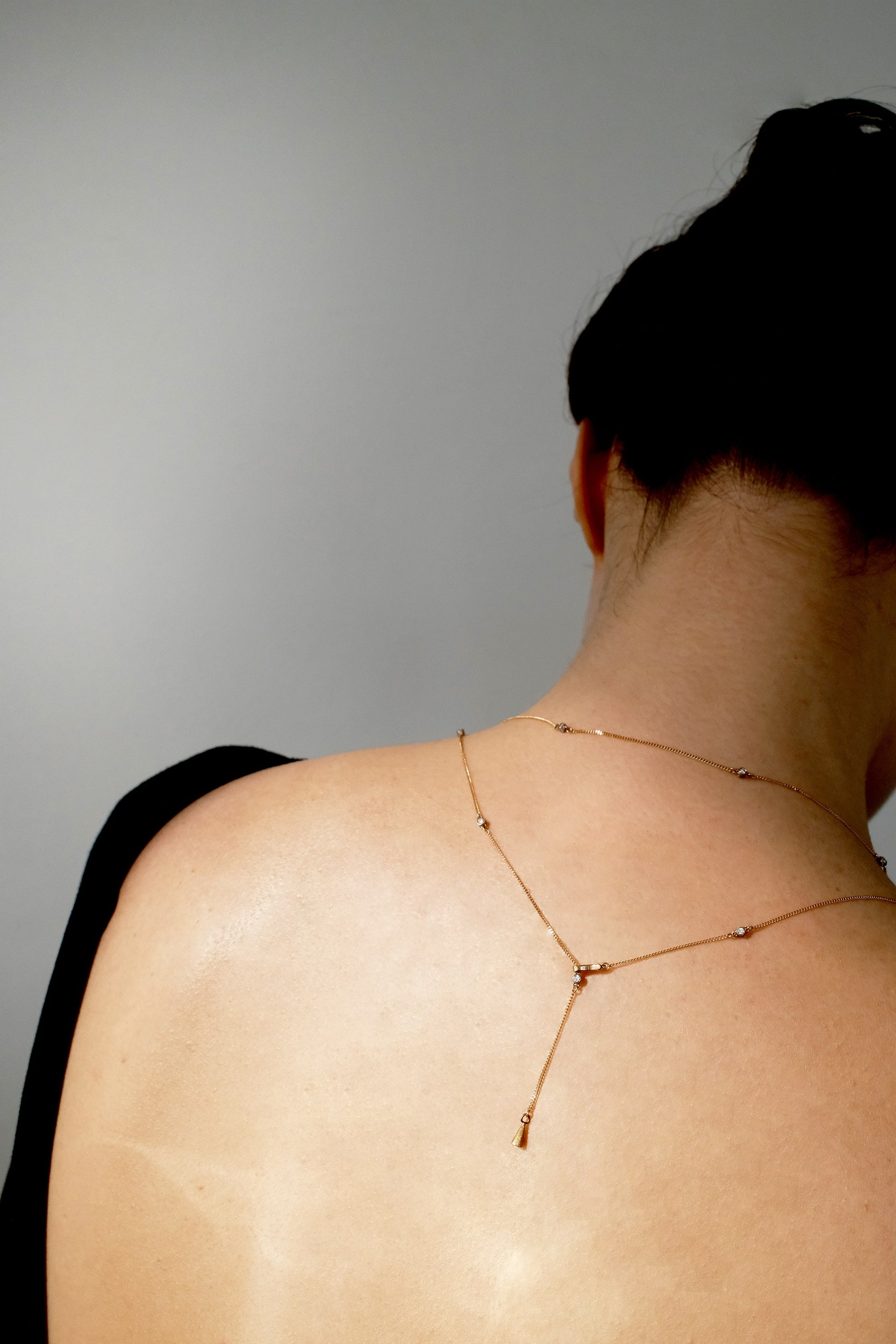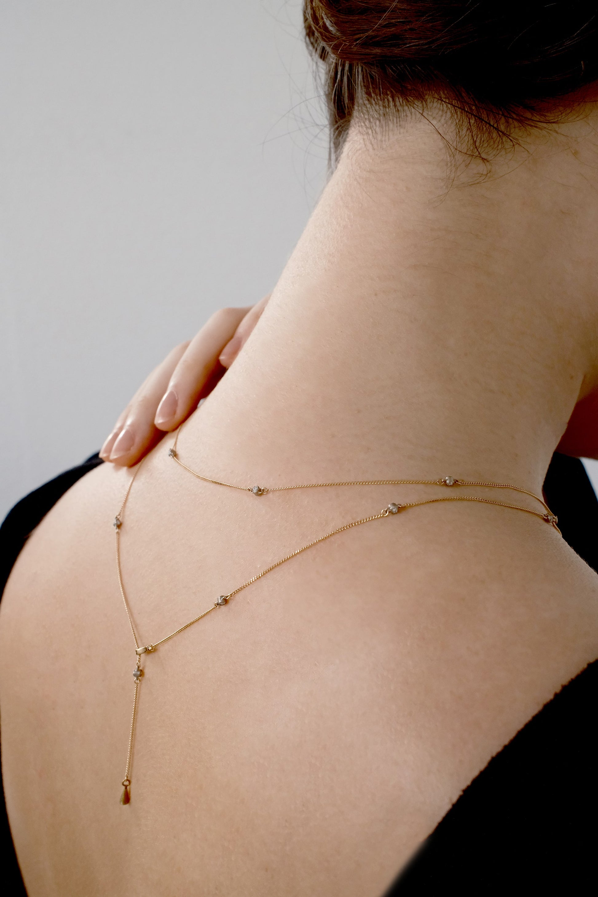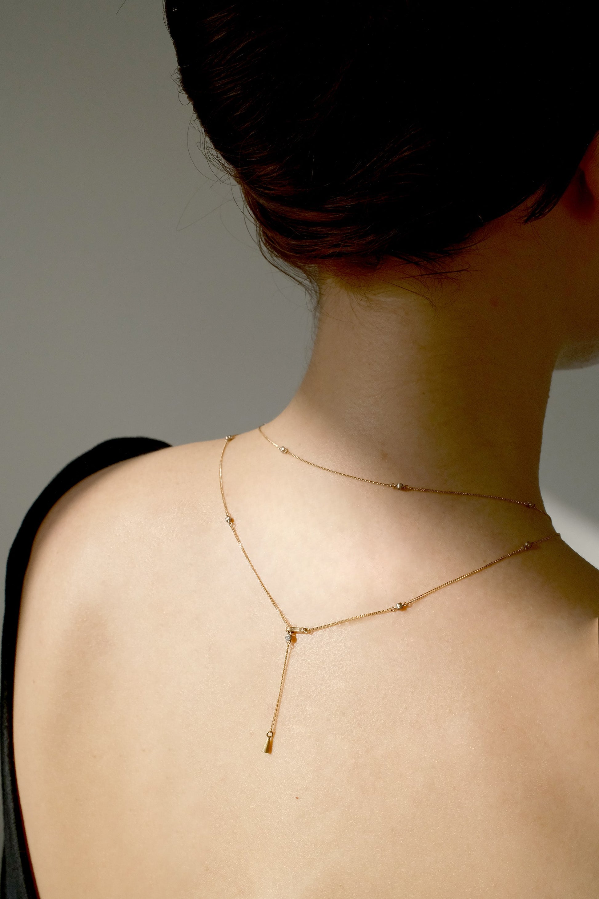 短く使用すると、余ったネックレス部分が背中で揺れる、情緒のあるデザインとなります。襟ぐりにあわせて雰囲気を変えることのできるこの設計は、SIXTH NIGHTならではのユニークなアイデアです。